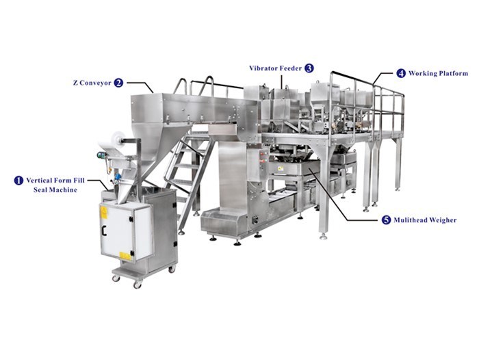 Το σύστημα συμπεριλαμβανομένου ενός τροφοδότη δονητών, μεταφορέας κάδων Ζ, λειτουργώντας πλατφόρμα, weigher Multihead, κάθετη μορφή γεμίζει τη μηχανή σφραγίδων, που τελειώνουν - μεταφορέας προϊόντων, Dropper ανιχνευτής μετάλλων. Πλήρως αυτόματη η μίξη weigher της μηχανής συσκευασίας τσαντών είναι για τα πρόχειρα φαγητά, τα δημητριακά, τον καφέ, το τσάι, το ρύζι, τα καρύδια, την καραμέλα, τα κοκκώδη, και προϊόντα σκονών σε ένα μαξιλάρι ή η τσάντα. Μπορεί να ενσωματωθεί με στα διάφορα υλικά πληρώσεως για να εκπληρώσει τους διαφορετικούς σκοπούς συσκευασίας, που κυμαίνονται από πολυ-επικεφαλής weighers συνδυασμού.